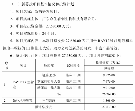 公告称,新募投项目“新药研发项目”拟投资27,630.00万元用于RAY1225注射液和昂拉地韦颗粒的III期临床试验,实施周期24个月。项目资金不足部分由众生睿创以自筹资金投入。